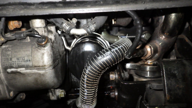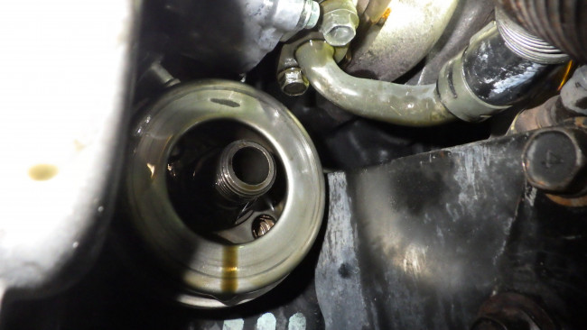 道具が入りづらかったので水冷式のオイルクーラを外し無事にガスケットを交換。