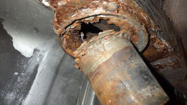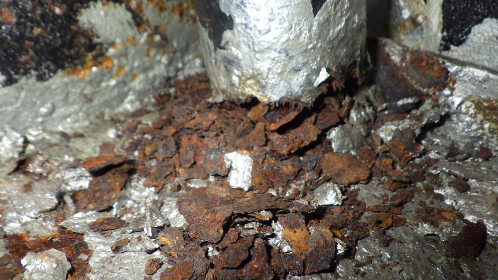 お約束のスプリング受け皿付近が腐食すると炭化物となったサビクズのカタマリは前方へ転がり水抜き穴を塞いでしまうのです。