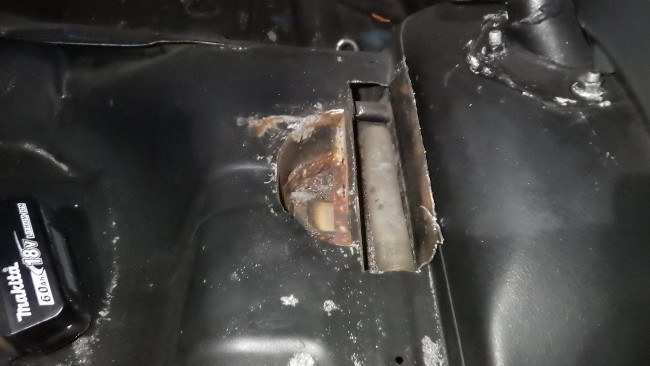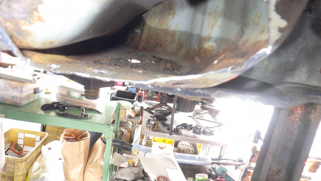 リヤフロアフロントメンバー回りを点検するためガソリンタンクを外します。