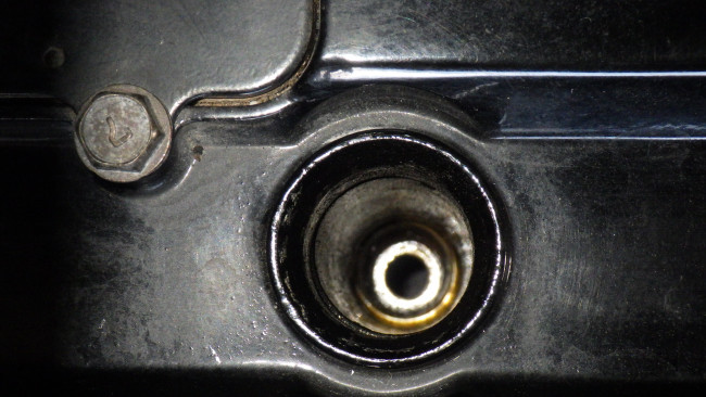 だいぶオイルで汚れています。プラグホール「ヘッドカバー」のパッキンも最終的に交換に至るのですが、この時はまだ交換しません。