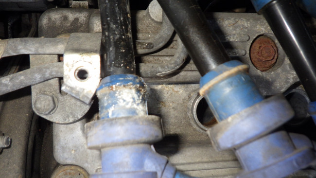 粉が吹いた感じに見えますがヘッドカバーを固定するボルトのサビ具合から塩カルを浴びていた可能性があり、車検時に洗浄をしていない可能性が高いです。