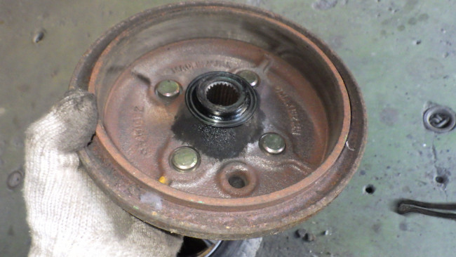 ヴィヴィオのリヤはアルトの様なホーシングタイプではないので、ブレーキドラムにデフオイルが滲む事はありません。多分ベアリンググリースの滲みだと思いますが、異音を含めてしばらく様子見です。