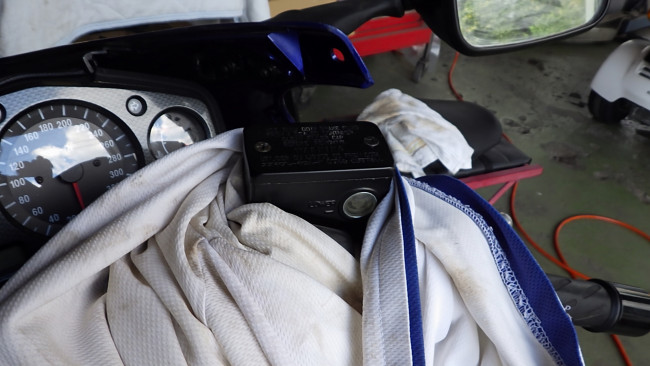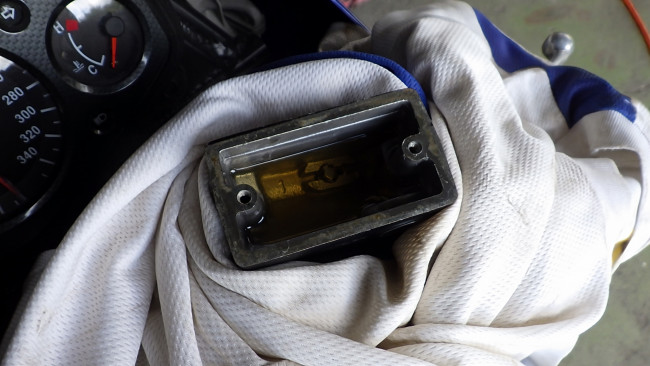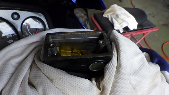 試乗明けの翌日、やけにフルード臭いと思ったら、ホイール裏とリヤブレーキのバックプレートがフルードでベチャベチャに・・・