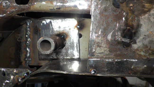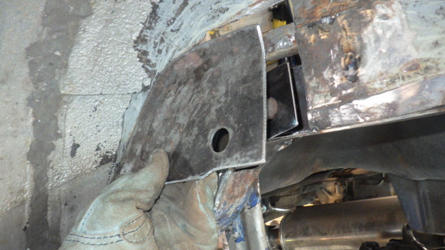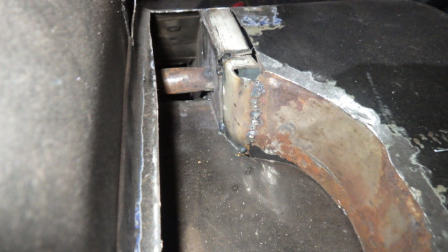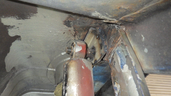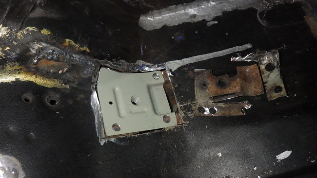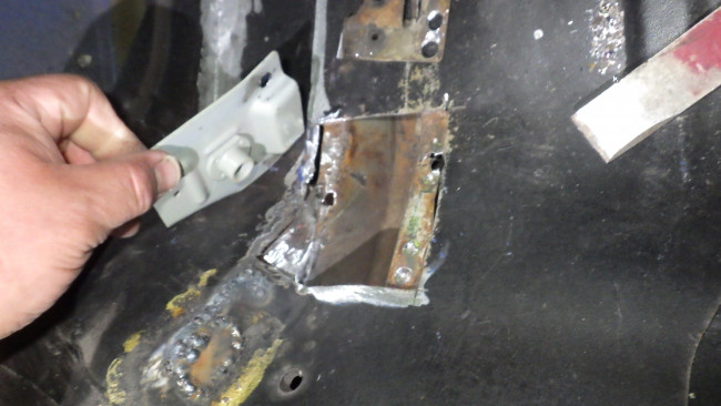 右側のリヤフロアサイドメンバーにスポットされているリヤシートベルトバックルが装着される部分も腐食が酷かったので、追加で補修します。