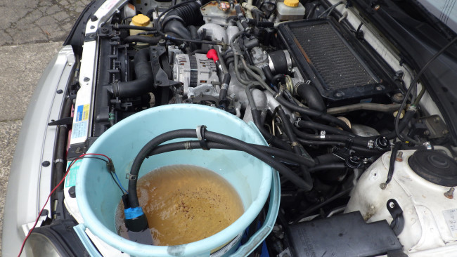 配管と配線をセットし、来るはずのB4タンクからのフューエルホースは、とりあえず空のバケツへ。