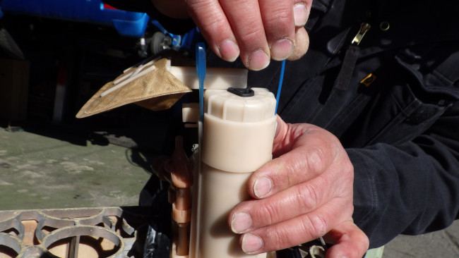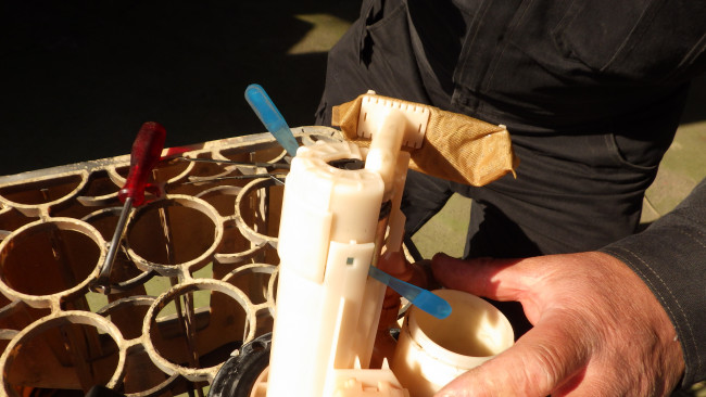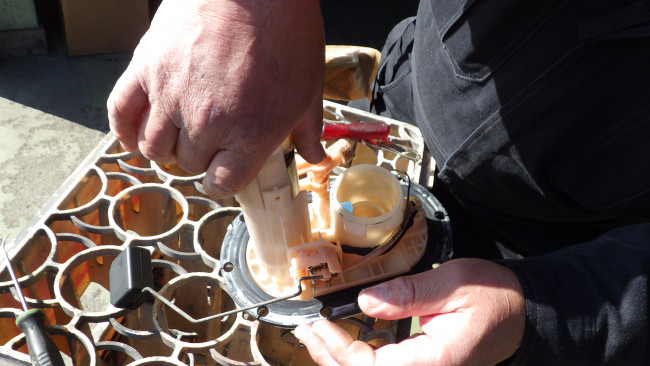 20年以上ガソリンに浸かっているので、さすがに新品と比べれば硬くなっているので、かつみんが注意深く分解しています。